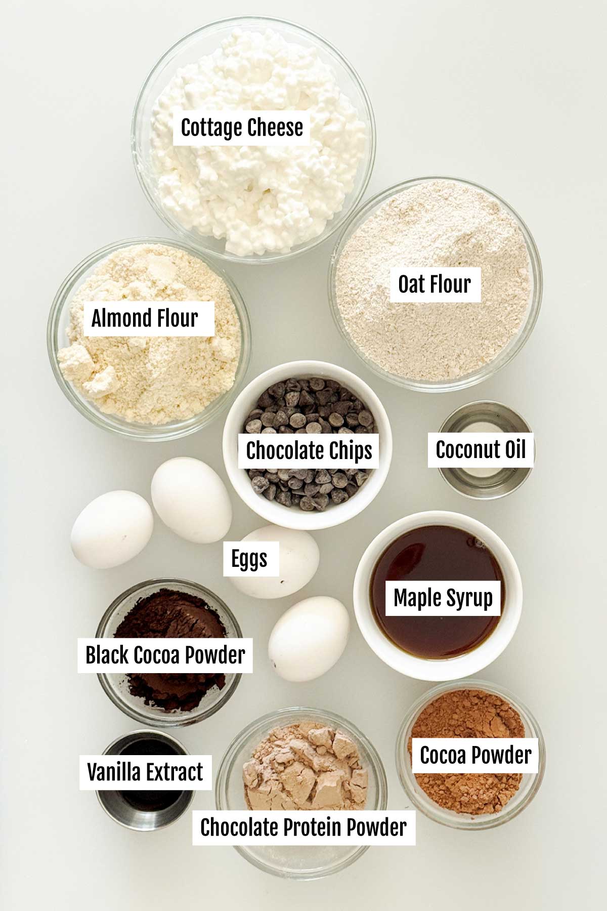 - Rinse out the food processor. Add 2 cups cottage cheese, ⅓ cup chocolate protein powder, ⅓ cup maple syrup, 2 tablespoons cocoa powder, 2 teaspoons vanilla extract, 1 teaspoon lemon juice, and ¼ teaspoon salt. Blend until completely smooth.In a microwave-safe bowl, melt ½ cup chocolate chips in 30-second intervals, stirring in between, until smooth.Pour the melted chocolate into the blended cottage cheese mixture. Add 2 eggs and 2 egg whites. Blend just until everything is incorporated.